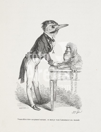 alb4085593 Vous allez etre un grand savant, et moi je vais l'annoncer au monde. Anthropomorphic image of a bird writing with a quill pen. Peines de cœur d'une chatte anglaise.-Guide-âne à l'usage des animaux qui veulent parvenir aux honneurs.-Voyage d'un lion d'Afrique à Paris.-Les Amours de deux bêtes. In: Stahl (P. J.) pseud. Scènes de la vie privée des animaux ... Études de mœurs contemporaines publiées sous la direction de M. P. J. Stahl, avec la collaboration de Messieurs de Balzac, L. Baude, etc. 1842. Source: 1457.k.1 plate opposite page 188. Author: Balzac, Honoré de. GRANDVILLE.