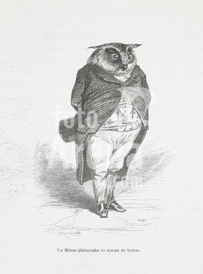 alb4085788 Un Hibou philosophe et oiseau de lettres. Anthropomorphic image of an owl. Peines de cœur d'une chatte anglaise.-Guide-âne à l'usage des animaux qui veulent parvenir aux honneurs.-Voyage d'un lion d'Afrique à Paris.-Les Amours de deux bêtes. In: Stahl (P. J.) pseud. Scènes de la vie privée des animaux ... Études de mœurs contemporaines publiées sous la direction de M. P. J. Stahl, avec la collaboration de Messieurs de Balzac, L. Baude, etc. 1842. 1842. Source: 1457.k.1. plate opposite page 113. Author: Balzac, Honoré de. GRANDVILLE.