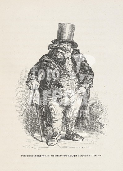 alb4086564 C'etait un habitue de la barriere du Combat, un Coq de la plus belle espece, il etait haut en jambes et se cambrait en marchant, comme un Coq qui ne veut rien perdre des avantages de sa taille. Anthropomorphic image of a vulture dressed in top hat and coat. Peines de cœur d'une chatte anglaise.-Guide-âne à l'usage des animaux qui veulent parvenir aux honneurs.-Voyage d'un lion d'Afrique à Paris.-Les Amours de deux bêtes. In: Stahl (P. J.) pseud. Scènes de la vie privée des animaux ... Études de mœurs contemporaines publiées sous la direction de M. P. J. Stahl, avec la collaboration de Messieurs de Balzac, L. Baude, etc. 1842. Source: 1457.k.1 plate opposite page 64. Author: Balzac, Honoré de. GRANDVILLE.