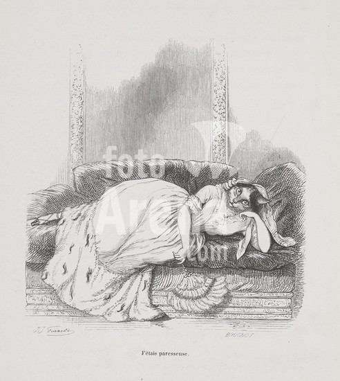 alb4086810 J'etais paresseuse. Anthropomorphic image of a cat on a sofa. Peines de cœur d'une chatte anglaise.-Guide-âne à l'usage des animaux qui veulent parvenir aux honneurs.-Voyage d'un lion d'Afrique à Paris.-Les Amours de deux bêtes. In: Stahl (P. J.) pseud. Scènes de la vie privée des animaux ... Études de mœurs contemporaines publiées sous la direction de M. P. J. Stahl, avec la collaboration de Messieurs de Balzac, L. Baude, etc. 1842. 1842. Source: 1457.k.1. plate opposite page 177. Author: Balzac, Honoré de. GRANDVILLE.