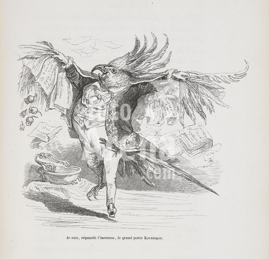 alb4087476 Je suis, repondit l'inconnu, le grand poete Kacatogan.' Anthropomorphic image of a parrot. Peines de cœur d'une chatte anglaise.-Guide-âne à l'usage des animaux qui veulent parvenir aux honneurs.-Voyage d'un lion d'Afrique à Paris.-Les Amours de deux bêtes. In: Stahl (P. J.) pseud. Scènes de la vie privée des animaux ... Études de mœurs contemporaines publiées sous la direction de M. P. J. Stahl, avec la collaboration de Messieurs de Balzac, L. Baude, etc. 1842. 1842. Source: 1457.k.1. plate opposite page 352. Author: Balzac, Honoré de. GRANDVILLE.