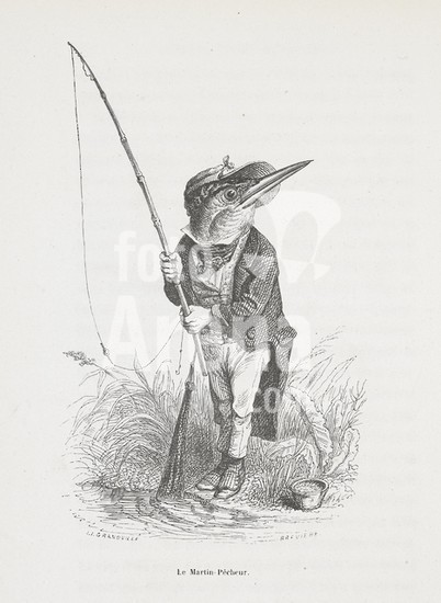 alb4089281 Le martin-pecheur. Anthropomorphic image of a Kingfisher. Peines de cœur d'une chatte anglaise.-Guide-âne à l'usage des animaux qui veulent parvenir aux honneurs.-Voyage d'un lion d'Afrique à Paris.-Les Amours de deux bêtes. In: Stahl (P. J.) pseud. Scènes de la vie privée des animaux ... Études de mœurs contemporaines publiées sous la direction de M. P. J. Stahl, avec la collaboration de Messieurs de Balzac, L. Baude, etc. 1842. 1842. Source: 1457.k.1. plate opposite page 111. Author: Balzac, Honoré de. GRANDVILLE.