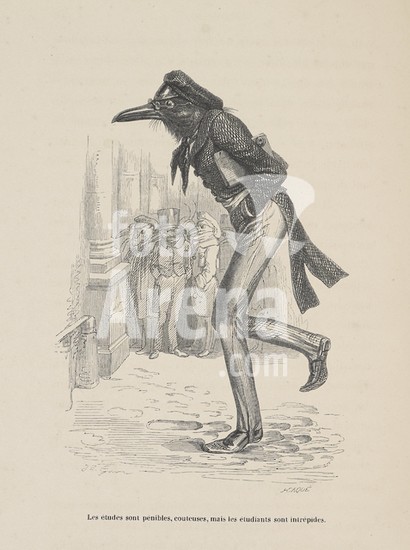 alb4092668 Les etudes sont penibles, couteuses, mais les etudiants sont intrepides. Anthropomorphic image of a bird, possibly a crow, as a student. Peines de cœur d'une chatte anglaise.-Guide-âne à l'usage des animaux qui veulent parvenir aux honneurs.-Voyage d'un lion d'Afrique à Paris.-Les Amours de deux bêtes. In: Stahl (P. J.) pseud. Scènes de la vie privée des animaux ... Études de mœurs contemporaines publiées sous la direction de M. P. J. Stahl, avec la collaboration de Messieurs de Balzac, L. Baude, etc. 1842. Source: 1457.k.1 plate opposite page 149. Author: Balzac, Honoré de. GRANDVILLE.