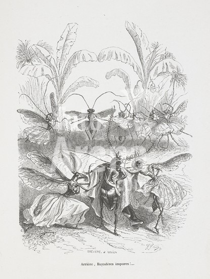 alb4093850 Arriere, Bayaderes impures! Anthropomorphic image of insects dancing. Peines de cœur d'une chatte anglaise.-Guide-âne à l'usage des animaux qui veulent parvenir aux honneurs.-Voyage d'un lion d'Afrique à Paris.-Les Amours de deux bêtes. In: Stahl (P. J.) pseud. Scènes de la vie privée des animaux ... Études de mœurs contemporaines publiées sous la direction de M. P. J. Stahl, avec la collaboration de Messieurs de Balzac, L. Baude, etc. 1842. 1842. Source: 1457.k.1. plate opposite page 248. Author: Balzac, Honoré de. GRANDVILLE.