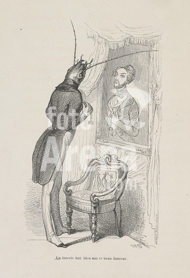 alb4095312 Un insecte fort bien mis et beau danseur. Anthropomorphic image of a beetle seeing it's reflection in a mirror, as human. Peines de cœur d'une chatte anglaise.-Guide-âne à l'usage des animaux qui veulent parvenir aux honneurs.-Voyage d'un lion d'Afrique à Paris.-Les Amours de deux bêtes. In: Stahl (P. J.) pseud. Scènes de la vie privée des animaux ... Études de mœurs contemporaines publiées sous la direction de M. P. J. Stahl, avec la collaboration de Messieurs de Balzac, L. Baude, etc. 1842. Source: 1457.k.1 plate opposite page 131. Author: Balzac, Honoré de. GRANDVILLE.