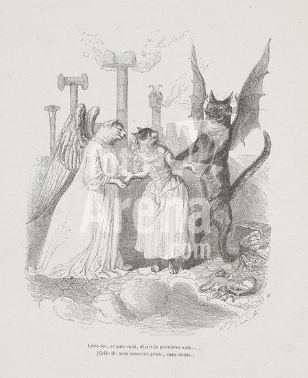 alb4067128 Leve-toi, et suis-moi, disait la premiere voix ... (Celle de mon mauvais genie, sans doute.) Anthropomorphic image of cats. Peines de cœur d'une chatte anglaise.-Guide-âne à l'usage des animaux qui veulent parvenir aux honneurs.-Voyage d'un lion d'Afrique à Paris.-Les Amours de deux bêtes. In: Stahl (P. J.) pseud. Scènes de la vie privée des animaux ... Études de mœurs contemporaines publiées sous la direction de M. P. J. Stahl, avec la collaboration de Messieurs de Balzac, L. Baude, etc. 1842. 1842. Source: 1457.k.1. plate opposite page 175. Author: Honoré de Balzac. GRANDVILLE.