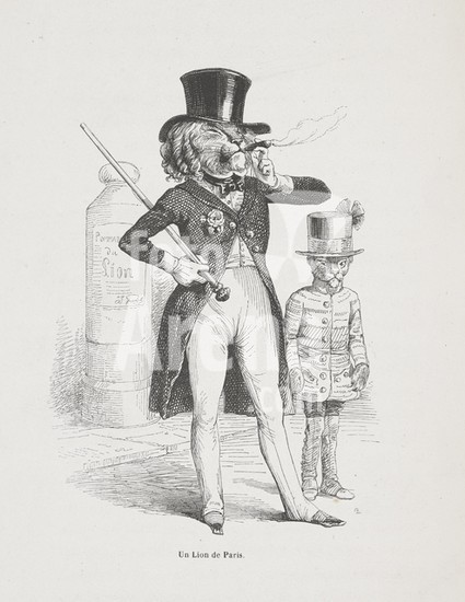 alb4075066 Un lion de Paris. Anthropomorphic image of a lion waering a top hat and tails, smoking a cigar. Peines de cœur d'une chatte anglaise.-Guide-âne à l'usage des animaux qui veulent parvenir aux honneurs.-Voyage d'un lion d'Afrique à Paris.-Les Amours de deux bêtes. In: Stahl (P. J.) pseud. Scènes de la vie privée des animaux ... Études de mœurs contemporaines publiées sous la direction de M. P. J. Stahl, avec la collaboration de Messieurs de Balzac, L. Baude, etc. 1842. 1842. Source: 1457.k.1. plate opposite page 375. Author: Honoré de Balzac.