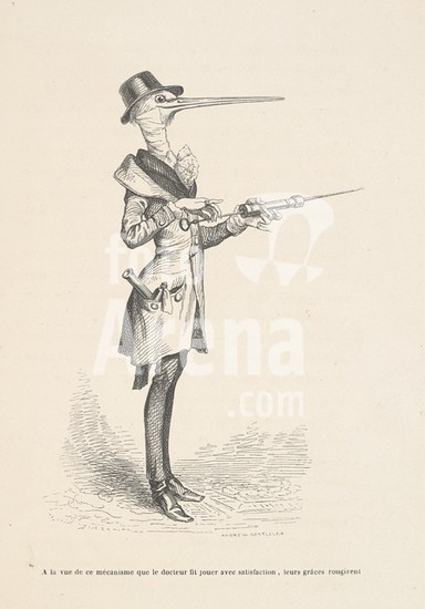 alb4077220 A la vue de ce mecanisme, que le docteur fit jouer avec satisfaction, Leurs Graces rougirent. Anthropomorphic image of a bird as a doctor, holding a large syringe. Peines de cœur d'une chatte anglaise.-Guide-âne à l'usage des animaux qui veulent parvenir aux honneurs.-Voyage d'un lion d'Afrique à Paris.-Les Amours de deux bêtes. In: Stahl (P. J.) pseud. Scènes de la vie privée des animaux ... Études de mœurs contemporaines publiées sous la direction de M. P. J. Stahl, avec la collaboration de Messieurs de Balzac, L. Baude, etc. 1842. Source: 1457.k.1 plate opposite page 104. Author: Honoré de Balzac. GRANDVILLE.