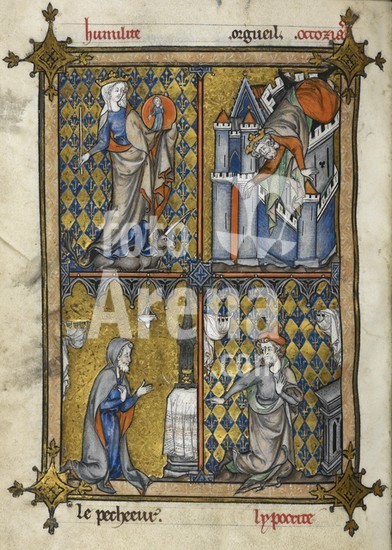 alb4094984 Top left, Humility, a crowned female figure standing on a unicorn. Top right, Pride, represented by Ahaziah falling from a tower. Bottom left, a sinner kneels before a draped and furnished altar. Bottom right, a hypocrite kneels before a bare altar and points derisively back at the sinner. La Somme le Roy. France (Paris); end of 13th century. Source: Add. 54180, f.97v. Language: French. Author: Frère Laurent. Maître Honoré.