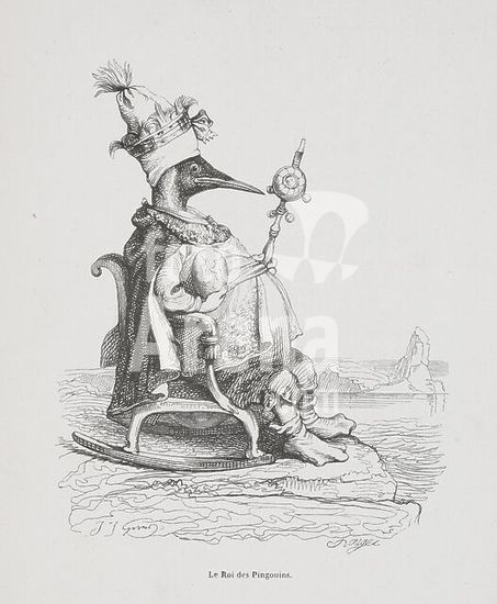 alb4054566 Le Roi des Pingouins.' Anthropomorphic image of a penguin as a king. Peines de cœur d'une chatte anglaise.-Guide-âne à l'usage des animaux qui veulent parvenir aux honneurs.-Voyage d'un lion d'Afrique à Paris.-Les Amours de deux bêtes. In: Stahl (P. J.) pseud. Scènes de la vie privée des animaux ... Études de mœurs contemporaines publiées sous la direction de M. P. J. Stahl, avec la collaboration de Messieurs de Balzac, L. Baude, etc. 1842. 1842. Source: 1457.k.1. plate opposite page 310. Author: Honoré de Balzac. GRANDVILLE.