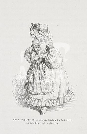 alb4057387 Elle a tout perdu, excepte ses six doigts qui la font vivre, et sa jolie figure qui ne gate rien. Anthropomorphic image of a cat wearing a dress. Peines de cœur d'une chatte anglaise.-Guide-âne à l'usage des animaux qui veulent parvenir aux honneurs.-Voyage d'un lion d'Afrique à Paris.-Les Amours de deux bêtes. In: Stahl (P. J.) pseud. Scènes de la vie privée des animaux ... Études de mœurs contemporaines publiées sous la direction de M. P. J. Stahl, avec la collaboration de Messieurs de Balzac, L. Baude, etc. 1842. 1842. Source: 1457.k.1. plate opposite page 169. Author: Honoré de Balzac. GRANDVILLE.