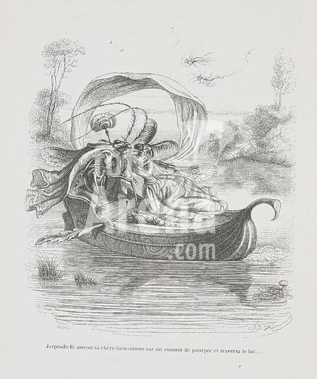alb4068275 Jarpeado fit asseoir sa chere bien-aimee sur un coussin de pourpre, et traversa le lac.' Anthropomorphic image of two insects, possibly ants, on a boat. Peines de cœur d'une chatte anglaise.-Guide-âne à l'usage des animaux qui veulent parvenir aux honneurs.-Voyage d'un lion d'Afrique à Paris.-Les Amours de deux bêtes. In: Stahl (P. J.) pseud. Scènes de la vie privée des animaux ... Études de mœurs contemporaines publiées sous la direction de M. P. J. Stahl, avec la collaboration de Messieurs de Balzac, L. Baude, etc. 1842. 1842. Source: 1457.k.1. plate opposite page 271. Author: Honoré de Balzac. GRANDVILLE.