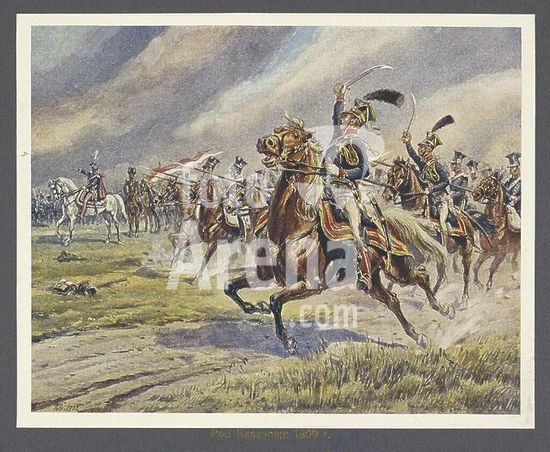 alb4076375 Pod raszynem 1809' (The Battle of Raszyn, 1809). Polish lancers in a cavalry charge. The first Battle of Raszyn was fought on 19 April 1809 between armies of the Austrian Empire and the Duchy of Warsaw, as part of the War of the Fifth Coalition in the Napoleonic Wars. The Austrians were defeated. For this victory, Poniatowski was presented with the grand-aigle de la Légion d'Honneur, a saber of honor, and a lancer's shako. Ksióążóę Józef (Prince Józef). Ilustracye kolorowe podług obrazów Br. Gembarzewskiego. [With plates, including portraits.]. Bytom, 1913. Source: 10797.d.2 plate opposite page 288. Author: Bronislaw Gembarzewski. A. M. Skalkowski.