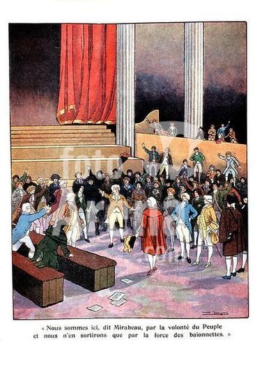 akg3794625 Französische Revolution / Französische Nationalversammlung im Ballhaus (Salle du Jeu de Paume) in Versailles / Sitzung am 23. Juni 1789. - "Nous sommes ici, dit Mirabeau, par la volonté du Peuple et nous n'en sortirons que par la force des baïonettes". - (Wir sind hier durch den Willen der Nation und werden nur der Macht der Bajonette weichen; - Honoré Gabriel de Riqueti, Grafo von Mirabeau, am 23. Juni 1789 in der Nationalversammlung zum Zeremonienmeister Henry-Evrard Dreux-Brézé). Farbdruck nach Zeichnung von Marcel Jeanjean (1893-1973). Aus: Les beaux épisodes de l'Histoire de France, Dessins en couleurs de Marcel Jeanjean, Paris (Librairie Hachette) 1922. Privatsammlung. Museum: PRIVATE COLLECTION. Copyright: © Marcel Jeanjean. This artwork is not in the public domain. It is your responsibility to obtain all necessary third party permissions from the copyright handler in your country prior to publication.