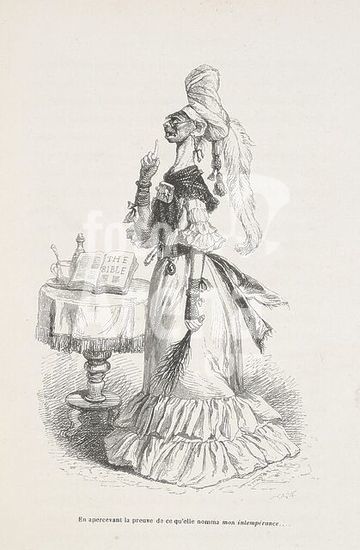 alb4060294 'En apercevant la preuve de ce qu'elle nomma mon intemperance ...'. A figure with a bible, holding a birch. Peines de cœur d'une chatte anglaise.-Guide-âne à l'usage des animaux qui veulent parvenir aux honneurs.-Voyage d'un lion d'Afrique à Paris.-Les Amours de deux bêtes. In: Stahl (P. J.) pseud. Scènes de la vie privée des animaux ... Études de mœurs contemporaines publiées sous la direction de M. P. J. Stahl, avec la collaboration de Messieurs de Balzac, L. Baude, etc. 1842. Source: 1457.k.1 plate opposite page 92. Author: Honoré de Balzac. GRANDVILLE.