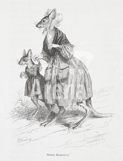 alb4066094 Maman kangourou. Anthropomorphic image of a kangaroo and roo. Peines de cœur d'une chatte anglaise.-Guide-âne à l'usage des animaux qui veulent parvenir aux honneurs.-Voyage d'un lion d'Afrique à Paris.-Les Amours de deux bêtes. In: Stahl (P. J.) pseud. Scènes de la vie privée des animaux ... Études de mœurs contemporaines publiées sous la direction de M. P. J. Stahl, avec la collaboration de Messieurs de Balzac, L. Baude, etc. 1842. 1842. Source: 1457.k.1. plate opposite page 93. Author: Honoré de Balzac. GRANDVILLE.