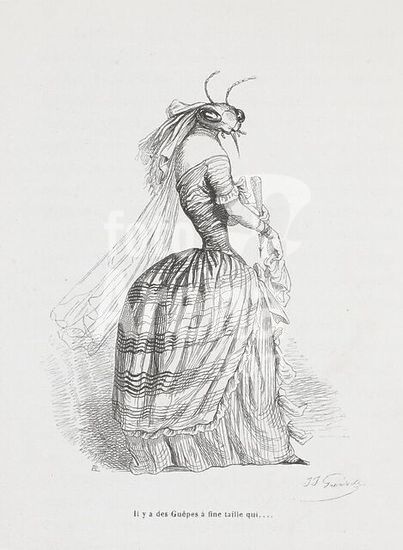 alb4069215 Il y a des Guepes a fine taille qui ... Anthropomorphic image of an insect wearing a dress. Peines de cœur d'une chatte anglaise.-Guide-âne à l'usage des animaux qui veulent parvenir aux honneurs.-Voyage d'un lion d'Afrique à Paris.-Les Amours de deux bêtes. In: Stahl (P. J.) pseud. Scènes de la vie privée des animaux ... Études de mœurs contemporaines publiées sous la direction de M. P. J. Stahl, avec la collaboration de Messieurs de Balzac, L. Baude, etc. 1842. 1842. Source: 1457.k.1. plate opposite page 117. Author: Honoré de Balzac. GRANDVILLE.