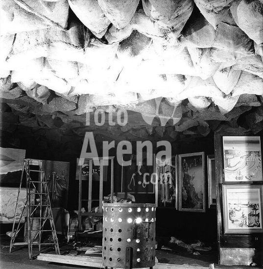 akg614334 Art exhibitions / "Exposition Internationale du Surréalisme", Paris, Galérie Beaux-Arts, 140 Rue du Faubourg-Saint-Honoré, January / February 1938. /. - Interior of the main room during setup (concept by Marcel Duchamp; 1887-1986); sacks of coal hanging from the ceiling; a coal-fired stove in the centre. Photo by Denise Bellon. Copyright: Manipulation of image strictly forbidden. This artwork is not in the public domain. Additional copyright clearance may be required before use of this image. © Marcel Duchamp.