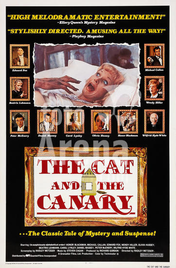 MCDCAAN_EC097 THE CAT AND THE CANARY, US poster, Carol Lynley (center), counter clockwise from top left: Edward Fox, Beatrix Lehmann, Peter McEnery, Daniel Massey, Carol Lynley, Olivia Hussey, Honor Blackman, Wilfrid Hyde White, Wendy Hiller, Michael Callan, 1978, © Cinema Shares/courtesy Everett Collection/Fotoarena