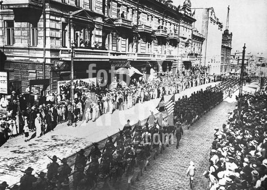 990_05_4-WWI-US-Russ_2HR Vladivostok, Siberia: October 24, 1918 U.S. troops on parade through the streets of Vladivostok during a celebration held in their honor. © Underwood Archives / The Image Works