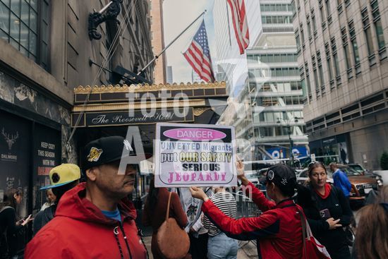 ny150923182206 Protesters gather outside of the Roosevelt Hotel in Manhattan, Sep. 15, 2023. After New York City?s mayor begged for help from the federal government, Congressional Democrats, including Alexandria Ocasio-Cortez, came to visit the city?s main migrant shelter. (Jeenah Moon/The New York Times/Fotoarena)