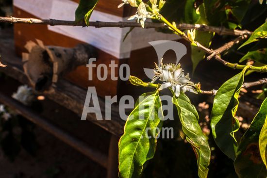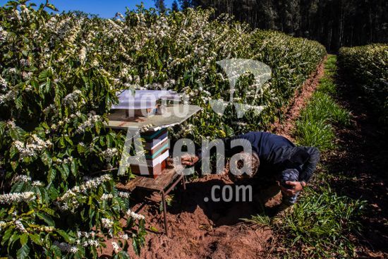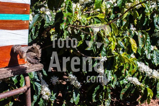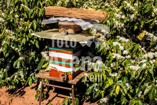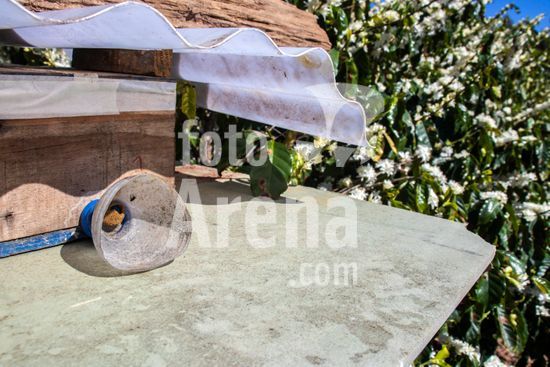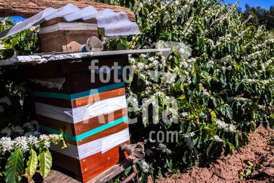 Ninho de abelhas sem ferrão nativas do Brasil, instalados em meio a uma plantação de café em flor no município de Vera Cruz, SP. A caixa abriga uma colônia de abelhas Mandaguari-preta (Scaptotrigona postica). A prática da meliponicultura ? criação de abelhas sem ferrão ? integrada à agricultura. Essas abelhas são polinizadoras essenciais para diversas plantas nativas e culturas agrícolas, como o café. Ao voarem de flor em flor para coletar néctar e pólen, elas aumentam a produtividade e a qualidade dos frutos, desempenhando um papel fundamental para a biodiversidade e a produção sustentável de alimentos.