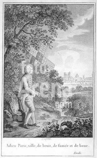 akg164583 Rousseau, Jean-Jacques, French writer, philosopher and educationalist, 1712-1778. Works: Emile (4 books; 1762). "Adieu Paris, ville, de (...) ". Copper engr. from book 4 by Dupreel. Fr.: Oeuvres de J.J.Rousseau, Nouv. Ed., vol. VI, Paris (Thomine et Fortic) 1822. Berlin, Sammlung Archiv für Kunst und Geschichte. Museum: Berlin, Sammlung Archiv für Kunst und Geschichte.