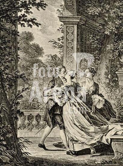 akg242218 Rousseau, Jean-Jacques; French wirter, philosopher and composer; 1712-78. Works: Julie ou La Nouvelle Héloïse. (novel, 1761). Julie and Saint-Preux in the garden. Engraving by Jean Michel Moreau le Jeune (1741-1814). From a 1774 edition.