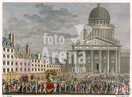 akg223510 Rousseau, Jean-Jacques: franz. Schriftsteller, Philosoph u. Pädagoge; , 1712-78. "APOTHEOSE DE J.J.ROUSSEAU (...) ". (Paris, 11. Okt. 1794; Überführung des Leichnams in das Pantheon). Radierung von Pierre Gabriel Berthault. (1748-1819) nach Zeichnung von Abraham Girardet (1764-1823). Aus: Tableaux de la Révolution Française, 1795 ff. Paris, Bibliothèque Nationale. Museum: Paris, Bibliothèque Nationale.
