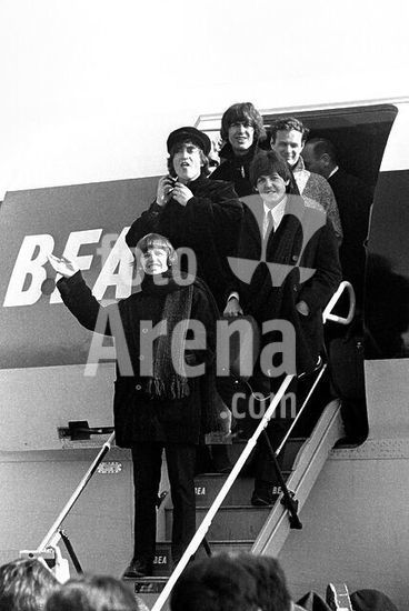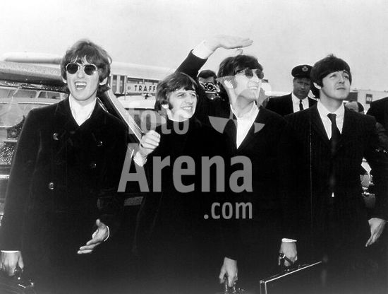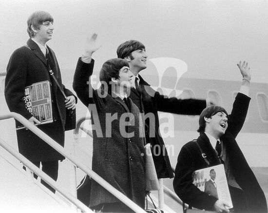 dpa554047 Die vier "Pilzköpfe" der britischen Popgruppe "The Beatles" bei ihrer Landung in Salzburg am 15. März 1965. Ringo Starr steht winkend auf der Gangway gefolgt von John Lennon (l) und Paul McCartney. Als letztes Mitglied der Band steigt George Harrison aus dem Flugzeug.