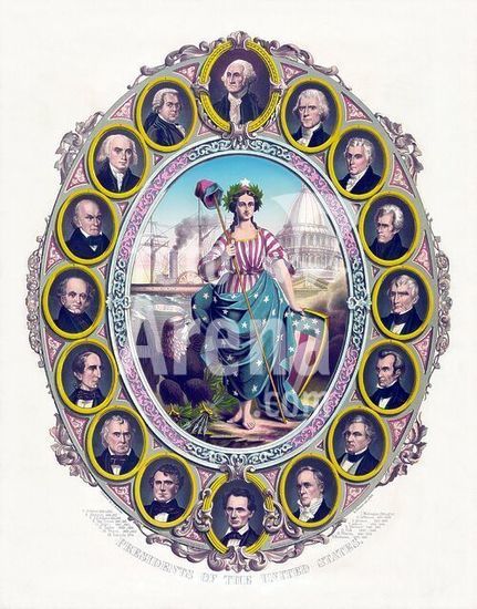 alb3881626 Digitally restored print featuring Lady Liberty and the first sixteen Presidents of The United States. Lady Liberty wears an American flag dress and is holding her shield.