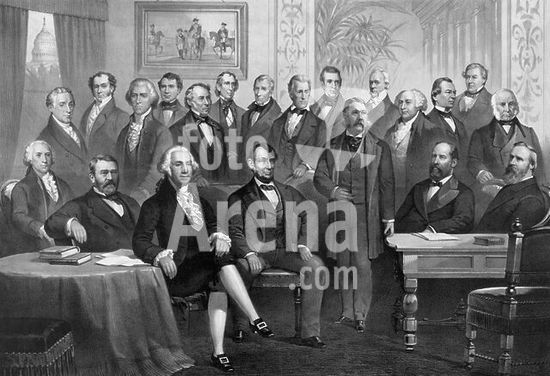 alb3884243 Vintage American history print of the first twenty-one Presidents of The United States, seated together in The White House. Included presidents are from right to left, James Madison, James Monroe, Martin Van Buren, Ulysses S. Grant, Thomas Jefferson, Franklin Pierce, George Washington, Zachary Taylor, John Tyler, William Henry Harrison, Abraham Lincoln, Andrew Jackson, James K. Polk, Chester Arthur, James Buchanan, John Adams, Andrew Johnson, James Garfield, Millard Fillmore, John Quincy Adams, and Rutherford B. Hayes.