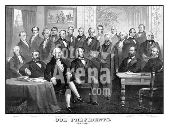 alb3884682 Vintage American history print of the first twenty-one Presidents of The United States seated together in The White House. It reads, Our Presidents. 1789 - 1881. Included presidents are from right to left, James Madison, James Monroe, Martin Van Buren, Ulysses S. Grant, Thomas Jefferson, Franklin Pierce, George Washington, Zachary Taylor, John Tyler, William Henry Harrison, Abraham Lincoln, Andrew Jackson, James K. Polk, Chester Arthur, James Buchanan, John Adams, Andrew Johnson, James Garfield, Millard Fillmore, John Quincy Adams, and Rutherford B. Hayes.