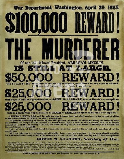 alb3887763 Vintage Civil War poster offering a reward for the capture of President Abraham Lincoln's assassins. The document provides descriptions of John H. Surratt, John Wilkes Booth, and David E. Harold. It is authorized by Secretary of War, Edwin M. Stanton.