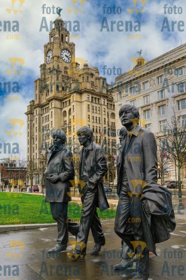 1278-252 The Beatles statue, bronze art depicting the famous band facing river Mersey with Royal Liver Building in the background, Liverpool, Merseyside, England, United Kingdom, EuropeLegenda da Fotoarena:The Beatles statue, bronze art depicting the famous band facing river Mersey with Royal Liver Building in the background, Liverpool, Merseyside, England, United Kingdom, Europe