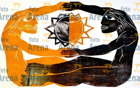 CIRO2603252044 Título: Encontro. Celebra o encontros dos povos do mundo. Técnica: xilogravura. Dimensões: 96 cm x 60 cm. Imagem feita com celular. Acervo pessoal