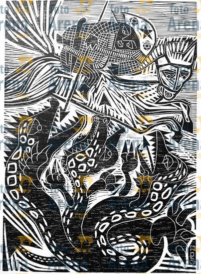 CIRO2603257054 Título: Galope Razante. São Jorge com chapeu de lampiao enfrentando o dragão.. Técnica: xilogravura. Dimensões: 64 cm x 42 cm. Imagem feita com celular. Acervo pessoal