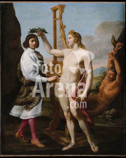 alb3608654 Marcantonio Pasqualini (1614-1691) Crowned by Apollo. Artist: Andrea Sacchi (Italian, Rome (?) ca. 1599-1661 Rome). Dimensions: 96 x 76 1/2 in. (243.8 x 194.3 cm). Date: 1641.A celebrated male soprano, Pasqualini is crowned by Apollo, who had been victorious in a musical contest with the satyr Marsyas (shown in the background, defeated and tied to a tree with his bagpipes beside him). Pasqualini joined the choir of the Sistine Chapel in 1630, and from 1632 was a protagonist in many operas produced at the Palazzo Barberini. Sacchi designed sets for some of these. The singer plays an upright harpsichord decorated with the figures of Daphne and a bound satyr; Apollo is loosely based on the famous ancient sculpture known as the Apollo Belvedere. Museum: Metropolitan Museum of Art, New York, USA.