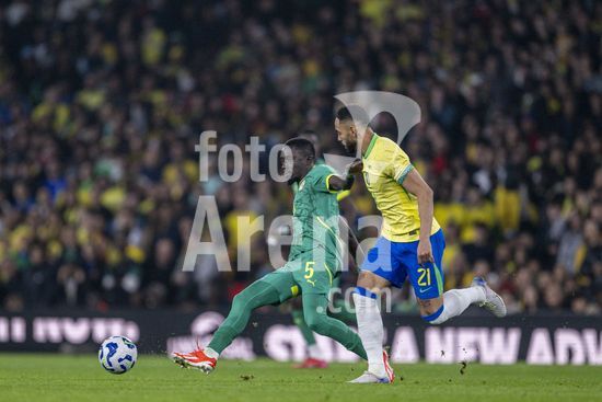 2843327 LONDRES, INGLATERRA - 15 DE NOVEMBRO: Idrissa Gana Gueye, do Senegal (E), passa a bola sob pressao de Matheus Cunha, do Brasil (D), durante o amistoso internacional entre Brasil e Senegal no Emirates Stadium, em 15 de novembro de 2025, em Londres, Inglaterra. (Foto de Richard Callis/Fotoarena)