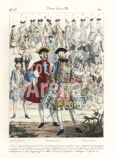 alb18731553 Courtiers and nobles, court of King Louis XV. Noblemen in tricorne, justaucorps, waistcoat, hose, with baroque frills and embroidery. Garde Francais, Courtisans 1725, Dames Nobles. Sous Louis 15. Handcoloured lithograph by Godard after an illustration by Charles Auguste Herbé from his own Costumes Francais, Civils, Militaires et Religieux, French Costumes, Civil, Military and Religious, Maison Martinet, Paris, 1837.