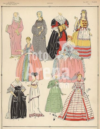 alb18732675 French women's dresses. 12th century gown 1, Renaissance-era 2, Louis XIII-era costume 3, Louis XIV-era noble 4, Louis XV-era dress 5, Louis XVI-era 6, Revolutionary gown 7, Empire dress 8, Restoration cambric musilin dress 9 and Second Empire dress 10. Hand-coloured pochoir (stencil) lithograph by T. You from Paul Louis de Giafferri's History of Feminine Costume of the World, Foreign Publications, New York, 1927.