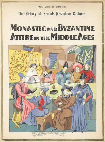 alb18733814 French bourgeois paying income taxes, 15th century. Magistrates collect cash from a bourgeois man and record payment in a register. Paiment de Rentes, France, XVe siecle. After a miniature from a manuscript book of accounts in the Bibliotheque de Rouen. Monastic and Byzantine Attire. Hand-coloured pochoir (stencil) lithograph by O. Macaire from Paul Louis de Giafferri's History of French Masculine Costume from 420 to 1870, Foreign Publications, New York, 1927.