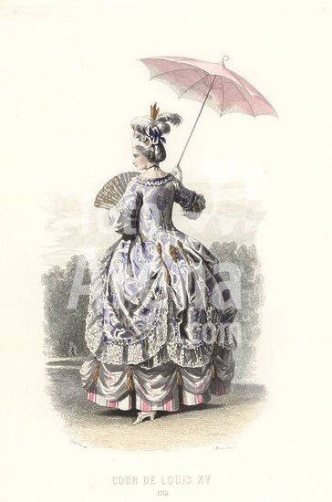 alb18735174 Noblewoman at the court of King Louis XIV of France. In tall hairdo with plumes, multi-layer gown with frills and ruches, holding a parasol and fan. Cour de Louis XV, 1715. Handcoloured steel engraving by Gabriel Xavier Montaut after an illustration by Francois Claudius Compte-Calix from Album Keepsake des Costumes de la cour Francaise depuis Charles VII jusqu'a Louis XVI, Keepsake Album of French Court Costumes from Charles VII to Louis XVI, Modes Parisiennes, Paris, 1854.