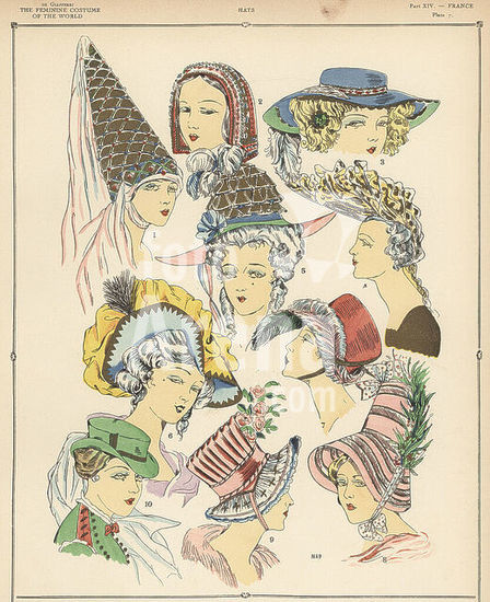 alb18735336 French women's hats. Medieval hennin with flocard veil 1, Renaissance biggin 2, Louis XIII era feather cap 3, Louis XIV era lace fan hat 4, Louis XV era capeline 5, Louis XVI era drapery 6, Restoration cabriolet 7, Napoleonic bonnet 8, Restoration velvet bonnet 9 and Second Empire hat 10. Hand-coloured pochoir (stencil) lithograph by NAB from Paul Louis de Giafferri's History of Feminine Costume of the World, Foreign Publications, New York, 1927.