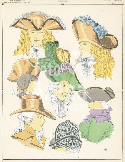 alb18738756 Hats and headgear of the era of Louis XV of France. Officer's wide tricorne 1, nobleman's hat with tufts of ostrich feathers 2, public musician's hat 3, plumed ceremonial headgear 4, town hat 5, wedding cap 6, and tricorne 7. Hand-coloured pochoir (stencil) lithograph by NAB from Paul Louis de Giafferri's History of French Masculine Costume from 420 to 1870, Foreign Publications, New York, 1927.