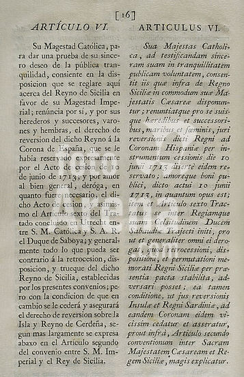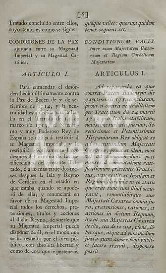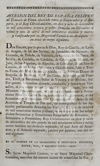 alb5432896 Accession by King Philip V of Spain to the Treaty of Vienna (18 November 1738) between Emperor Charles VI of Germany and Louis XV of France to end the War of the Polish Succession (1733-1735). Spain acceded the following year, signing at Versailles on 21 April 1739. It was ratified by King Philip V at Aranjuez the following 13 May. Article I. Collection of the Treaties of Peace, Alliance, Commerce adjusted by the Crown of Spain with the Foreign Powers (Colección de los Tratados de Paz, Alianza, Comercio ajustados por la Corona de España con las Potencias Extranjeras). Volume II. Madrid, 1800. Historical Military Library of Barcelona, Catalonia, Spain.