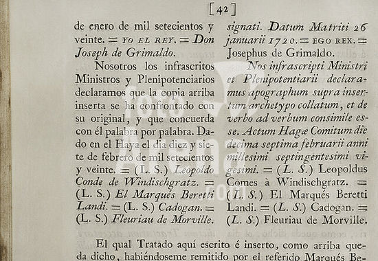 alb5432882 Quadruple Alliance. Formed in London on 2 August 1718 by the Holy Roman Empire, the United Provinces of the Netherlands, France and Great Britain, with the aim of forming a coalition in response to Spanish belligerence that refused to abide by the Treaty of Utrecht of 1713 in relation to the former Spanish territories in Italy and the Netherlands. By signing the "Treaty of The Hague" (17 February 1720), Spain acceded to the Treaty of the Quadruple Alliance, which reorganised a division of disputed territories. This treaty was ratified by King Philip V of Spain in Aranjuez on 20 May of that year. Detail of the declarations of the ministers and plenipontiaries Leopold Count of Windischgratz, the Marquis of Beretti Landi, Cadogan and Fleureian de Morville, at The Hague, by which they authenticate the copy with the original document of the treaty. Collection of the Treaties of Peace, Alliance, Commerce adjusted by the Crown of Spain with the Foreign Powers (Colección de los Tratados de Paz, Alianza, Comercio ajustados por la Corona de España con las Potencias Extranjeras). Volume II. Madrid, 1800. Historical Military Library of Barcelona, Catalonia, Spain.