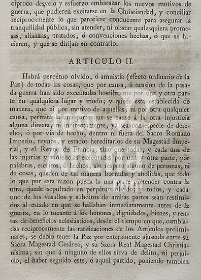 alb5432883 Accession by King Philip V of Spain to the Treaty of Vienna (18 November 1738) between Emperor Charles VI of Germany and Louis XV of France to end the War of the Polish Succession (1733-1738). Spain acceded the following year, signing at Versailles on 21 April 1739. It was ratified by King Philip V at Aranjuez the following 13 May. Article II (on perpetual oblivion or amnesty for wartime events). Collection of the Treaties of Peace, Alliance, Commerce adjusted by the Crown of Spain with the Foreign Powers (Colección de los Tratados de Paz, Alianza, Comercio ajustados por la Corona de España con las Potencias Extranjeras). Volume II. Madrid, 1800. Historical Military Library of Barcelona, Catalonia, Spain.