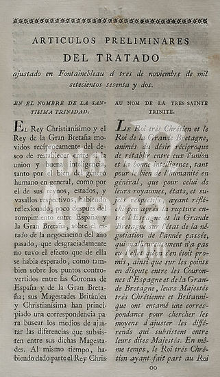 alb5432885 Preliminary articles of the Treaty concluded at Fontainebleau on 3 November 1762 between the kingdoms of France and Spain. France ceded to Spain the historic North American territory of Louisiana, one of the administrative divisions of New France (the area colonised by France in North America). Collection of the Treaties of Peace, Alliance, Commerce adjusted by the Crown of Spain with the Foreign Powers (Colección de los Tratados de Paz, Alianza, Comercio ajustados por la Corona de España con las Potencias Extranjeras). Volume III. Madrid, 1801. Historical Military Library of Barcelona, Catalonia, Spain.