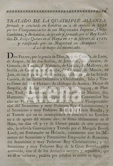 alb5432894 Quadruple Alliance. Formed in London on 2 August 1718 by the Holy Roman Empire, the United Provinces of the Netherlands, France and Great Britain, with the aim of forming a coalition in response to Spanish belligerence that refused to abide by the Treaty of Utrecht of 1713 in relation to the former Spanish territories in Italy and the Netherlands. By signing the "Treaty of The Hague" (17 February 1720), Spain acceded to the Treaty of the Quadruple Alliance, which reorganised a division of disputed territories. This treaty was ratified by King Philip V of Spain in Aranjuez on 20 May of that year. Article I (conditions for peace). Collection of the Treaties of Peace, Alliance, Commerce adjusted by the Crown of Spain with the Foreign Powers (Colección de los Tratados de Paz, Alianza, Comercio ajustados por la Corona de España con las Potencias Extranjeras). Volume II. Madrid, 1800. Historical Military Library of Barcelona, Catalonia, Spain.